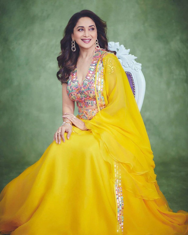 Madhuri Dixit began shooting for Dance Dewaane and looked ethereal in a sunshine yellow lehenga with a vibrant, mirror work multicolored choli. She was seen wearing the Asal by Abu Jani and Sandeep Khosla. She kept her makeup dewy with soft waves. Madhuri Dixit- even after all these years doesn't fail to impress with her beauty and glam.