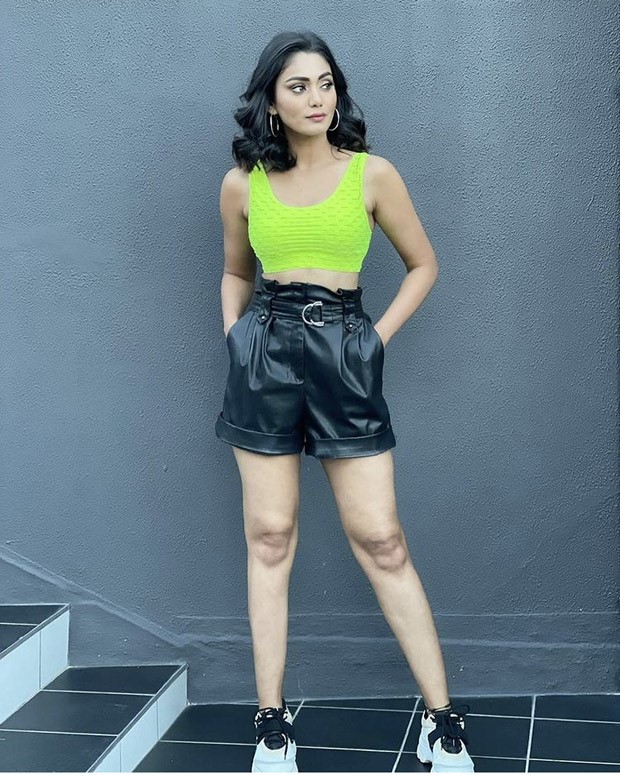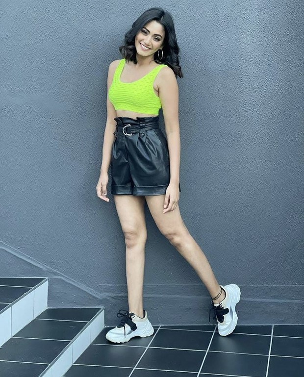 A day ago, she posed in neon green sports bra and high-waist black leather shorts. She wore an identical belt that had silver buckle around her shorts. Along with that she also wore hoop earrings and aqua-colour sports shoes. She rocked her minimal makeup look and freshly curled hair. She posed graciously in this outfit that just made this picture a lot more wholesome.